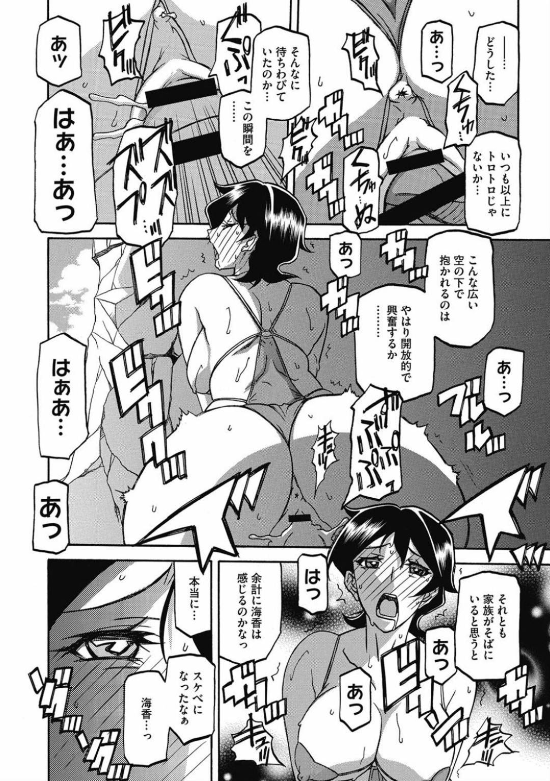 - 【エロ漫画】海でパート先の店長と家族旅行に来て浮気セックスする巨乳人妻…家族を目の前に店長にエロ水着を着せられ激しくバックでチンポをマンコに挿れられ、旦那に謝りながら快楽堕ち浮気セックス!【山文京伝】